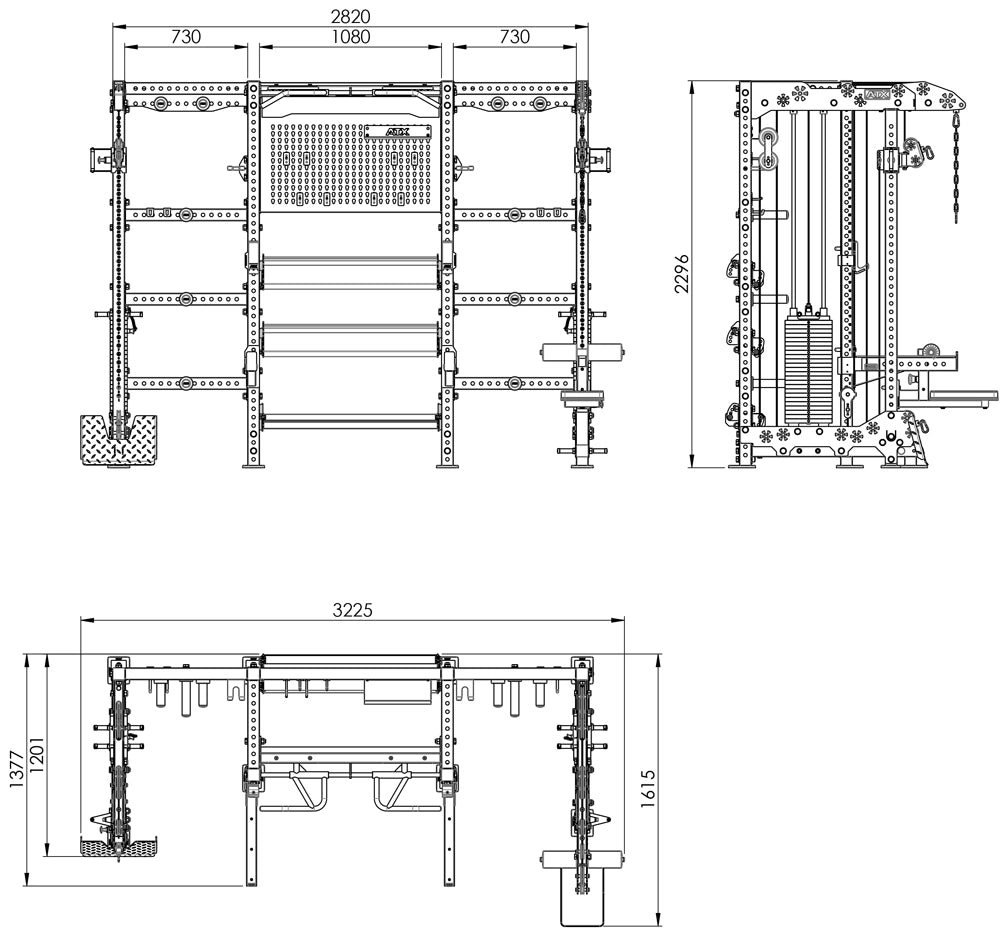 - Zugstationen: Zwei Zugstationen mit jeweils 125 kg Steckgewichten, 1:1 Übersetzung, integrierten Roller Band-Pegs für Widerstandsbänder